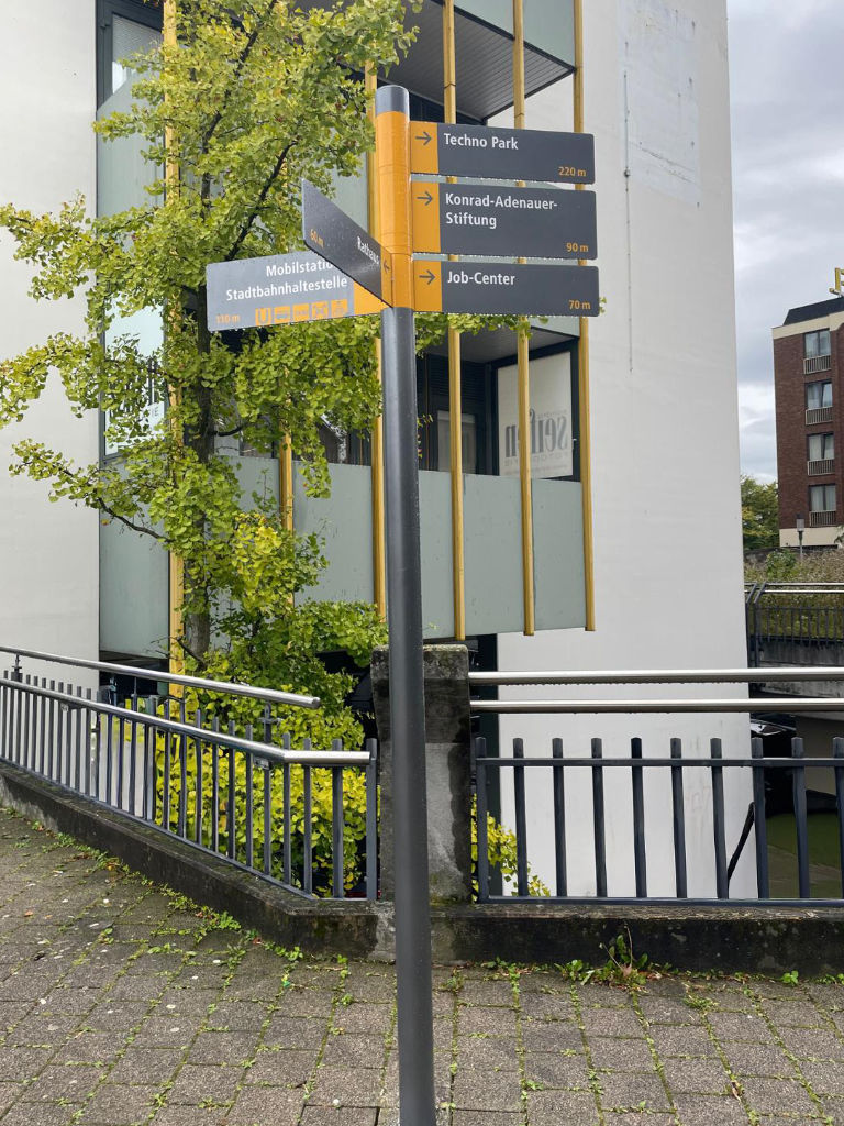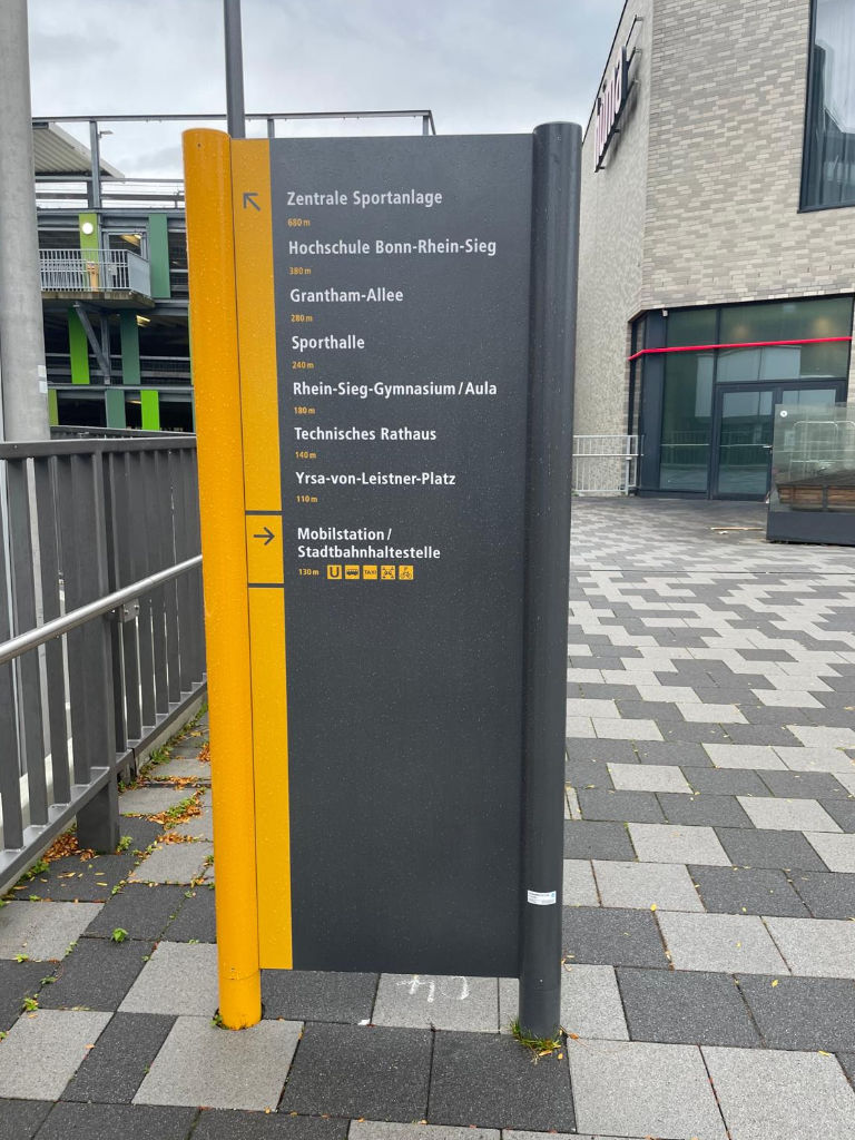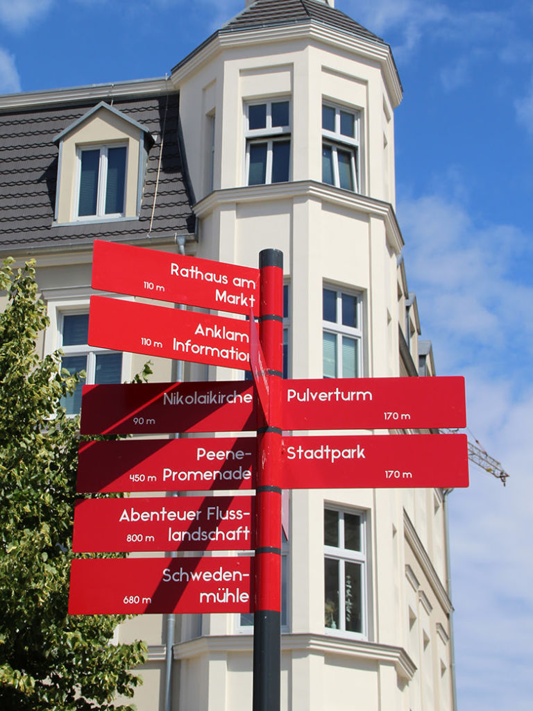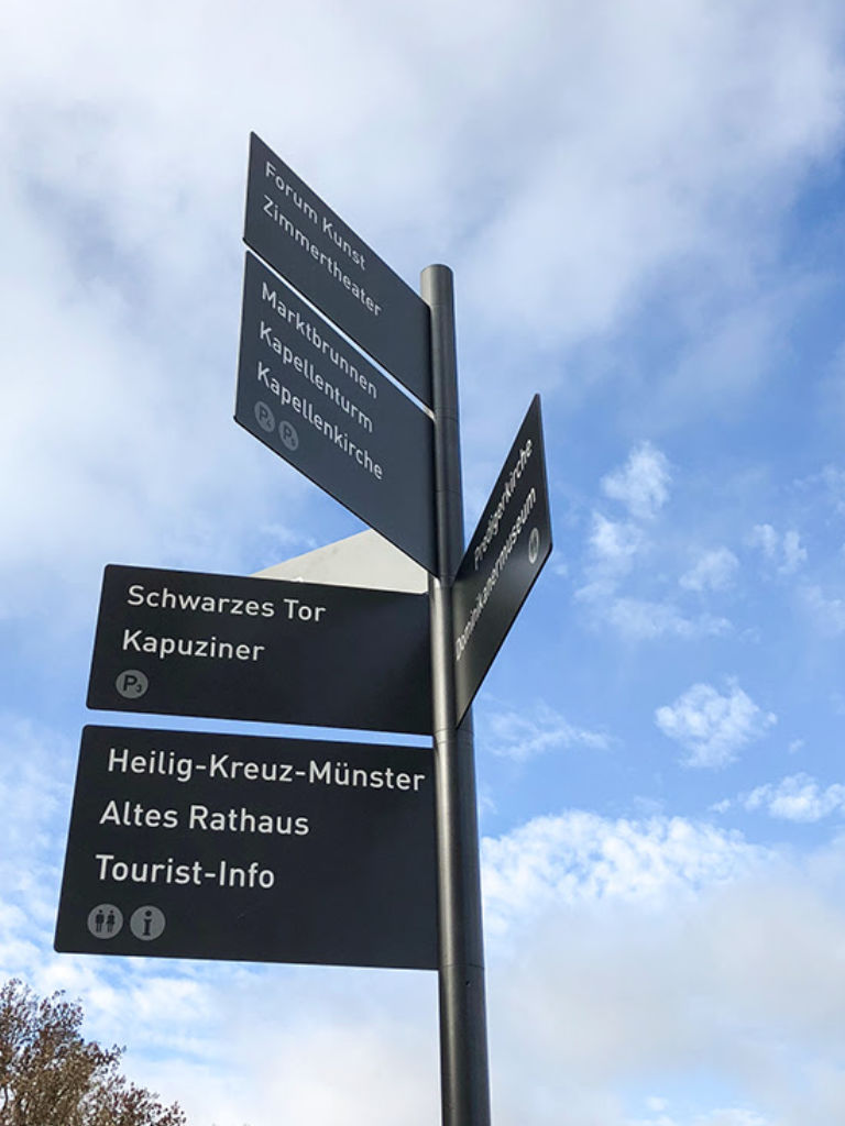 Die modular aufgebauten Wegeleitsysteme ermöglichen eine klare Struktur im öffentlichen Raum – von der Wegweisung bis zur Informationstafel.