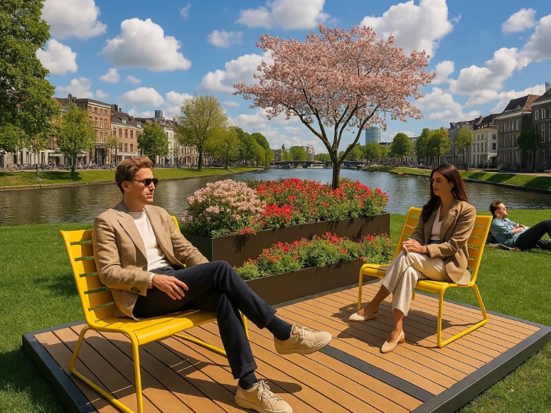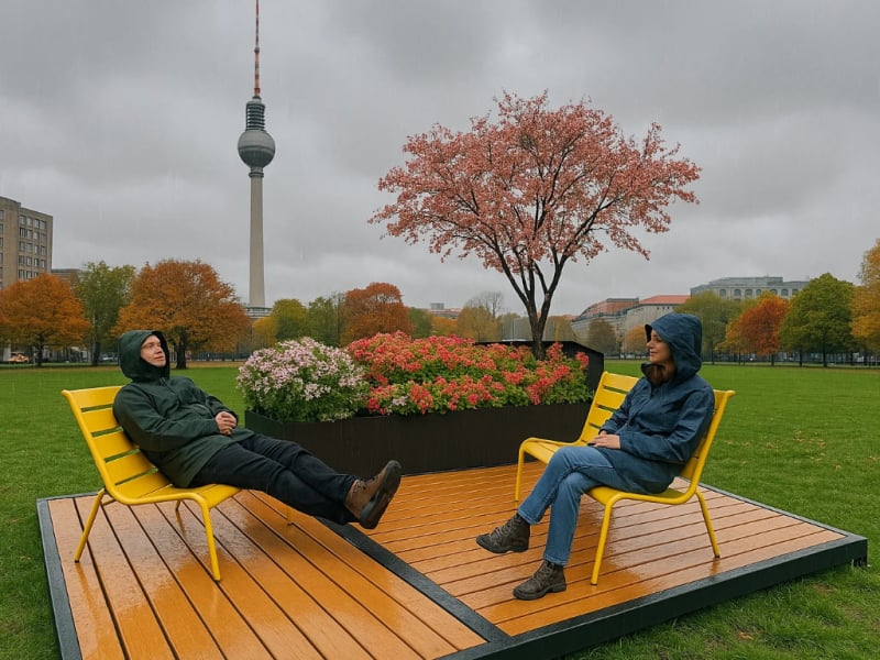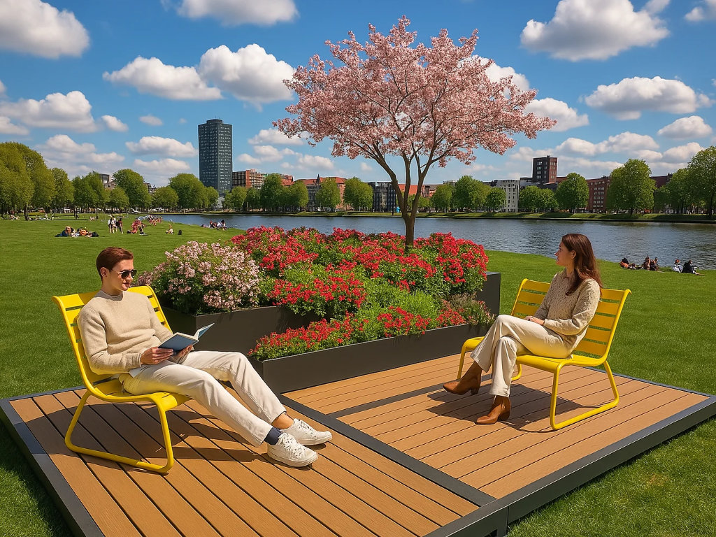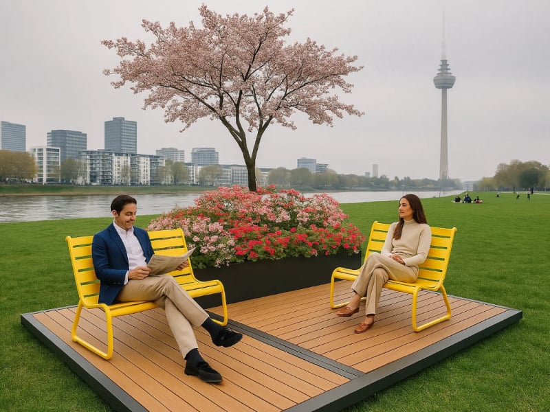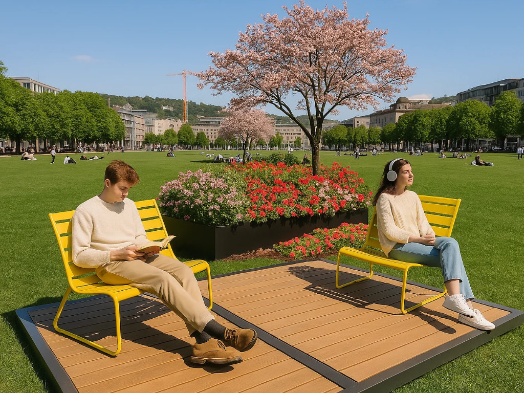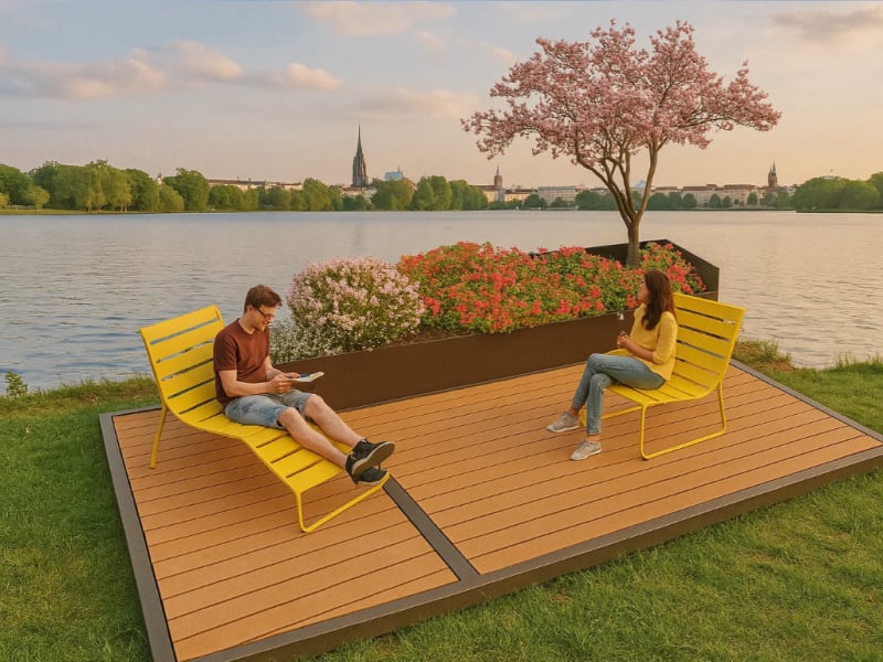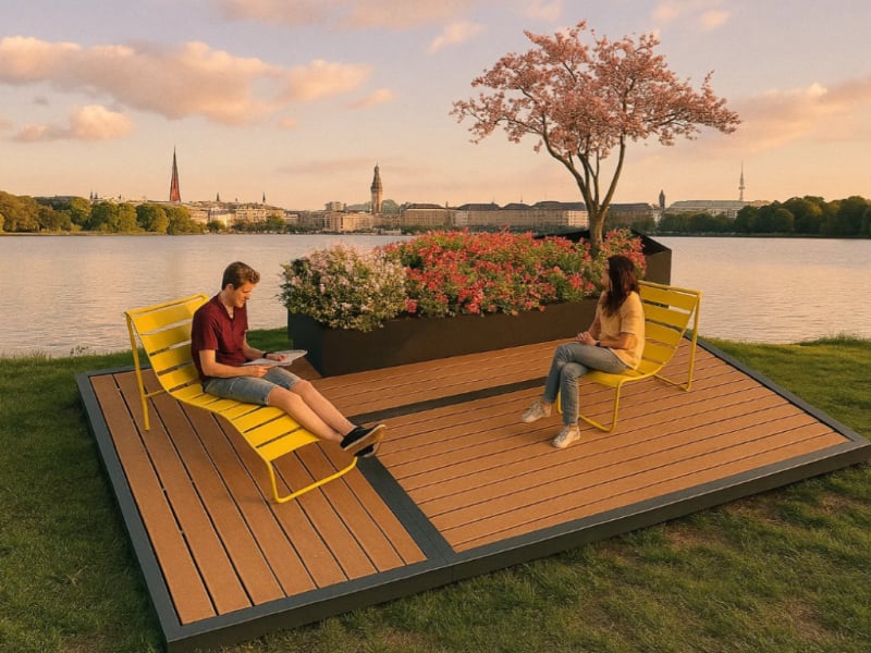 Der "Pocket Park Cadira" ist eine innovative Lösung zur Schaffung von grünen Oasen im urbanen Raum. Die Basis bildet eine Plattform aus FSC 100 % zertifiziertem Hartholz, deren Holzauflage wahlweise quer- oder längslaufend sowie behandelt oder unbehandelt gestaltet werden kann. Metallkomponenten sind pulverbeschichtet und in einer RAL-Farbe nach Wahl erhältlich, um eine harmonische Integration in die Umgebung zu ermöglichen. Ausgestattet mit der "Cadira Chaise Longue" und der "Cadira Liege" bietet dieser Pocket Park komfortable Sitz- und Liegemöglichkeiten. Das modulare Design erlaubt eine flexible Anpassung an verschiedene räumliche Gegebenheiten und kann durch zusätzliche Elemente wie Pflanzschalen oder Schattenstrukturen erweitert werden. Die Befestigung erfolgt freistehend, was eine einfache Installation und Mobilität gewährleistet. Form und Farbe können individuell an Kundenwünsche angepasst werden, um maßgeschneiderte Lösungen für urbane Räume zu schaffen.