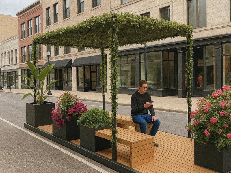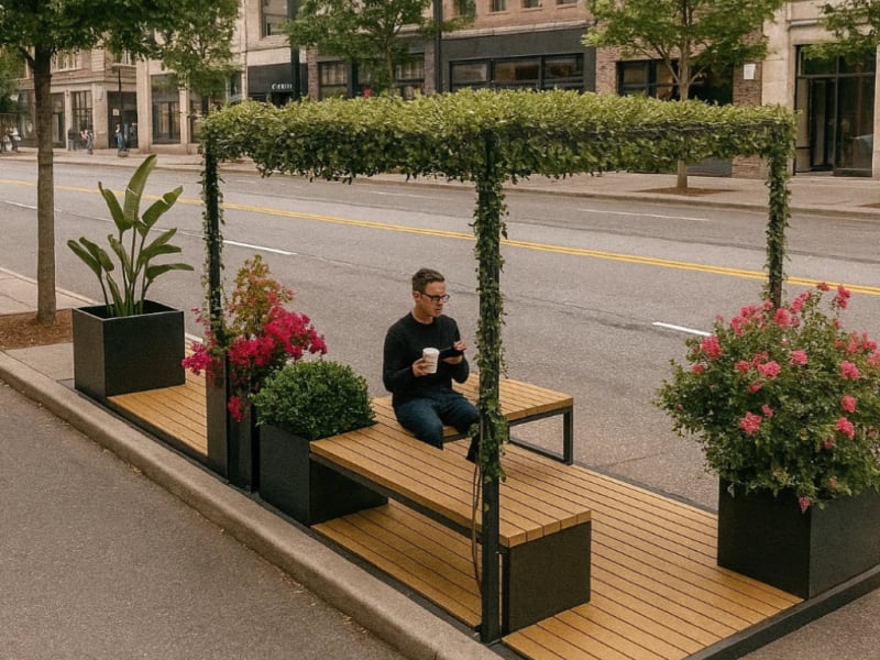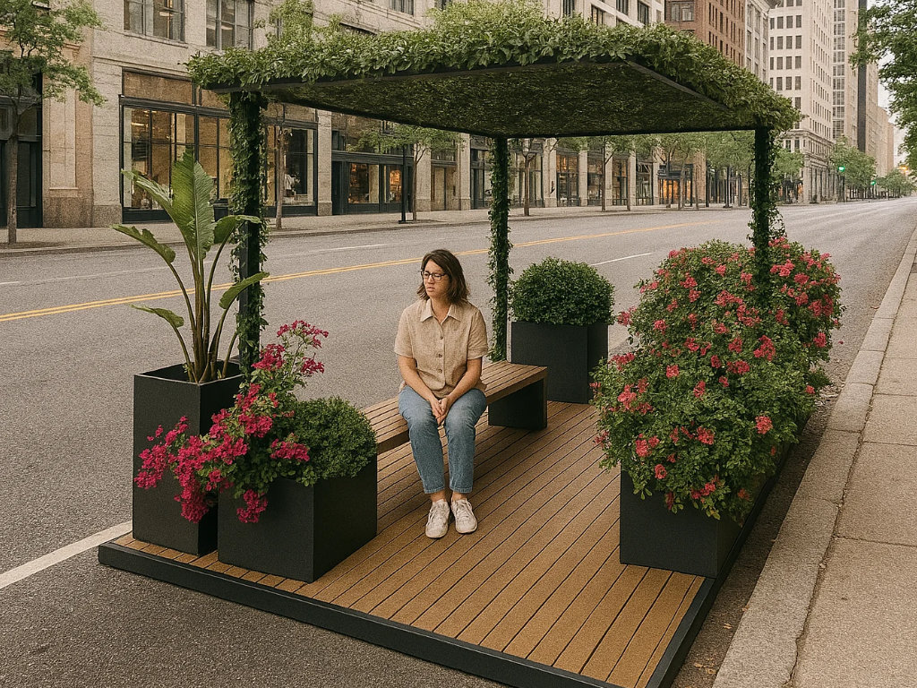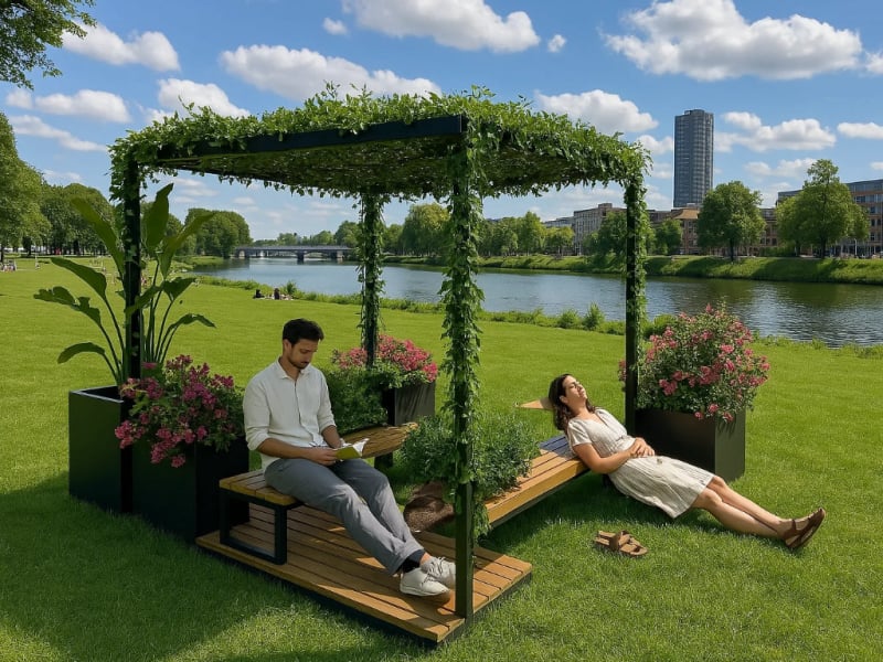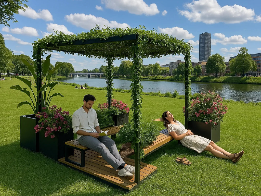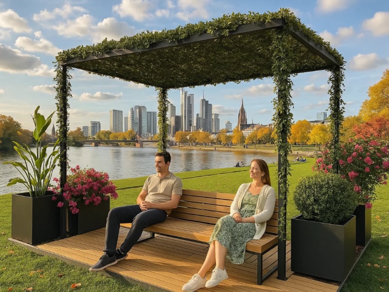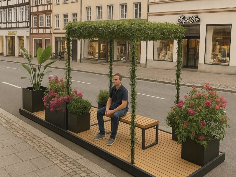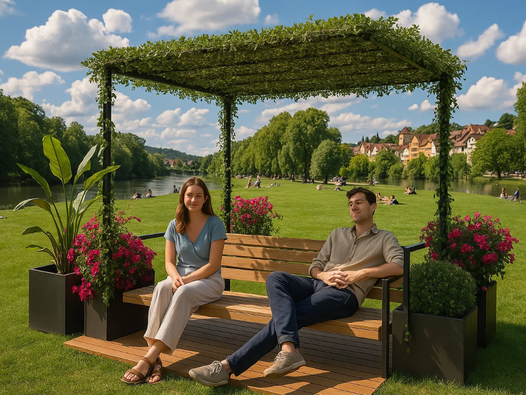 Der "Pocket Park Green" verwandelt begrenzte städtische Flächen in einladende Erholungsräume. Die Basis bildet eine Plattform aus FSC-zertifiziertem Hartholz, deren Bohlen je nach Wunsch quer oder längs verlaufen und behandelt oder unbehandelt sein können. Metallkomponenten sind pulverbeschichtet und können in einer RAL-Farbe nach Wahl gestaltet werden, um eine harmonische Integration in die Umgebung zu gewährleisten. Ausgestattet mit der Sitzgelegenheit "Linea" und einer Pergola, die angenehmen Schatten spendet, lädt dieser Pocket Park zum Verweilen ein. Das modulare Design ermöglicht eine flexible Anpassung an verschiedene räumliche Gegebenheiten und kann durch zusätzliche Elemente wie Pflanzschalen erweitert werden. Die Befestigung kann entweder durch Einbetonieren oder Aufschrauben erfolgen, je nach den Gegebenheiten vor Ort. Dieses Konzept erlaubt es, urbane Räume flexibel und ansprechend zu gestalten und dabei individuelle Kundenwünsche in Form und Farbe zu berücksichtigen.