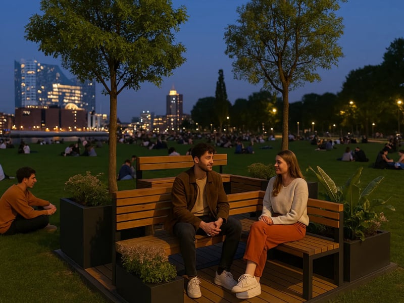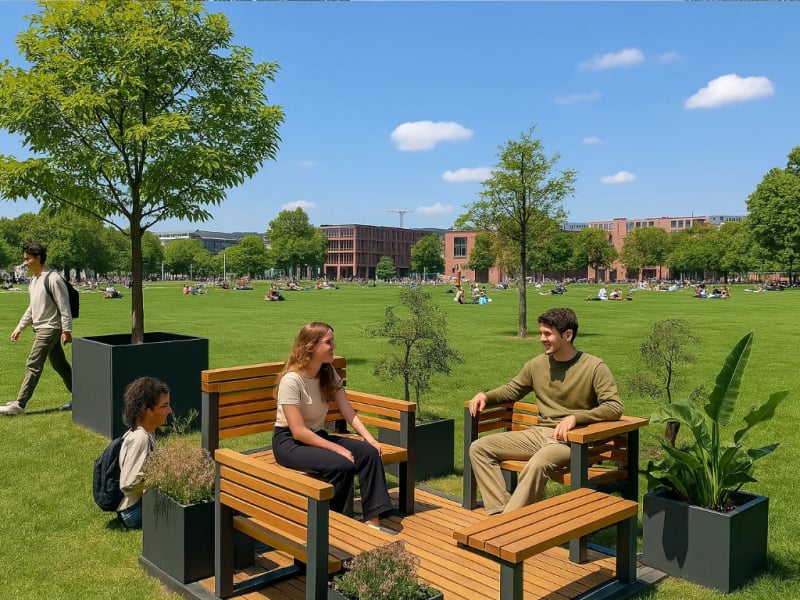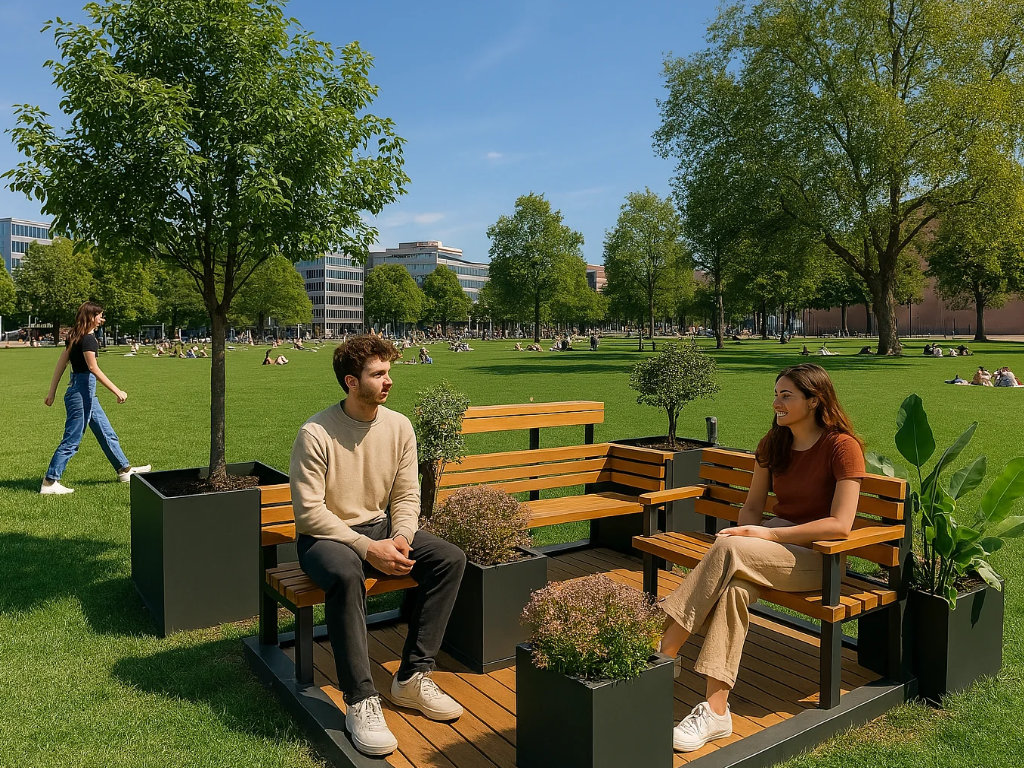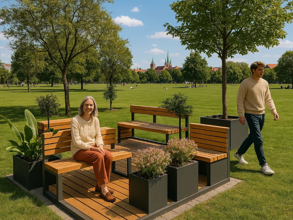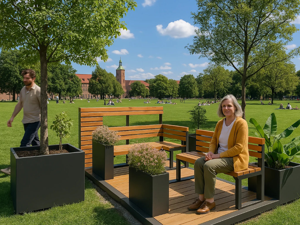 Der Pocket Park ist mit der Sitzgelegenheit „Linea“ sowie einer Pergola ausgestattet, die angenehmen Schatten spendet – ideal zum Verweilen, Lesen oder Entspannen. Zusätzliche Elemente wie Pflanzschalen erweitern die Gestaltungsmöglichkeiten. Alle Komponenten lassen sich frei kombinieren und an räumliche sowie gestalterische Anforderungen anpassen. Die Befestigung erfolgt freistehend, was eine unkomplizierte Montage und hohe Flexibilität erlaubt. Form, Farbe und Aufbau werden individuell auf deine Wünsche abgestimmt – und bei Fragen zur Gestaltung oder Technik stehen wir dir natürlich jederzeit zur Seite.