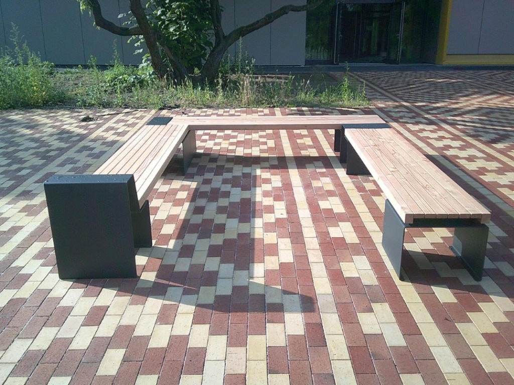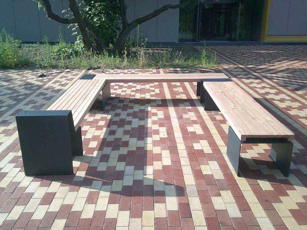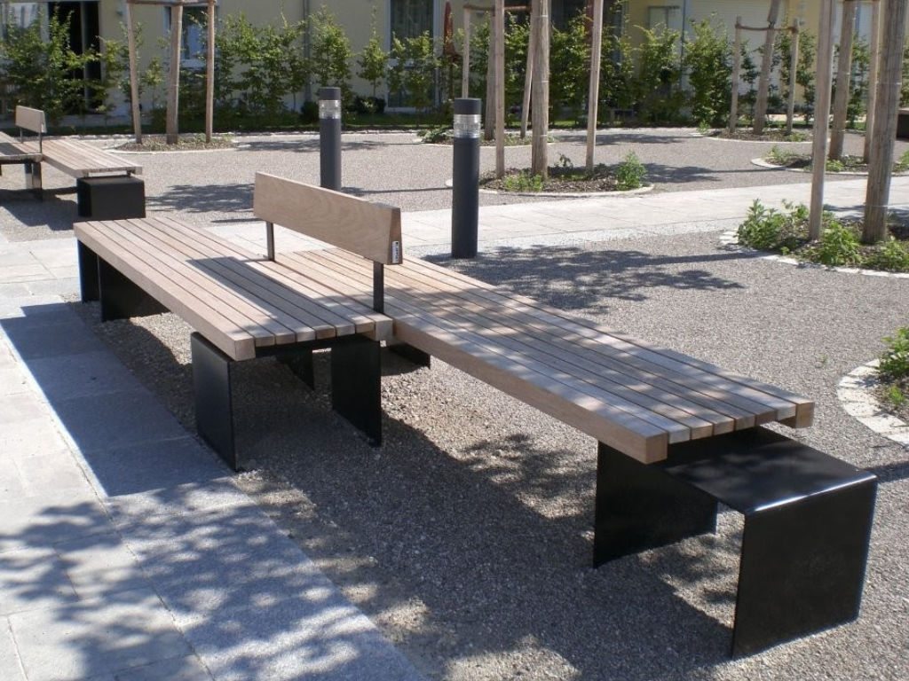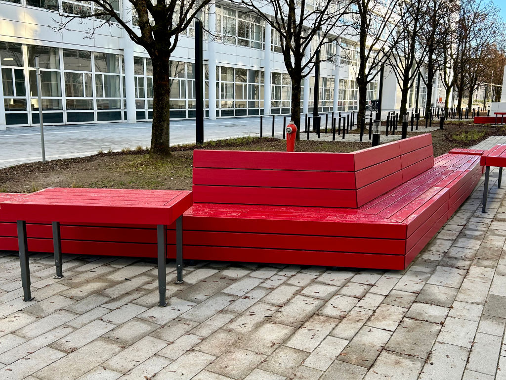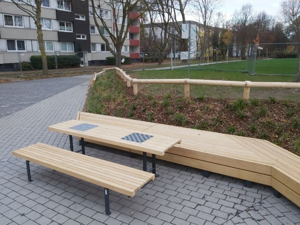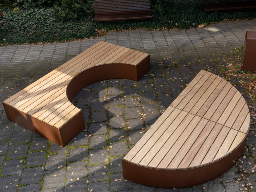 Großformatige Bänke ohne Lehne, wie z. B. im Stadtpark Moers – offen, flexibel, gemeinschaftlich. Ideal für Plätze, auf denen Kommunikation und Bewegung im Vordergrund stehen.
