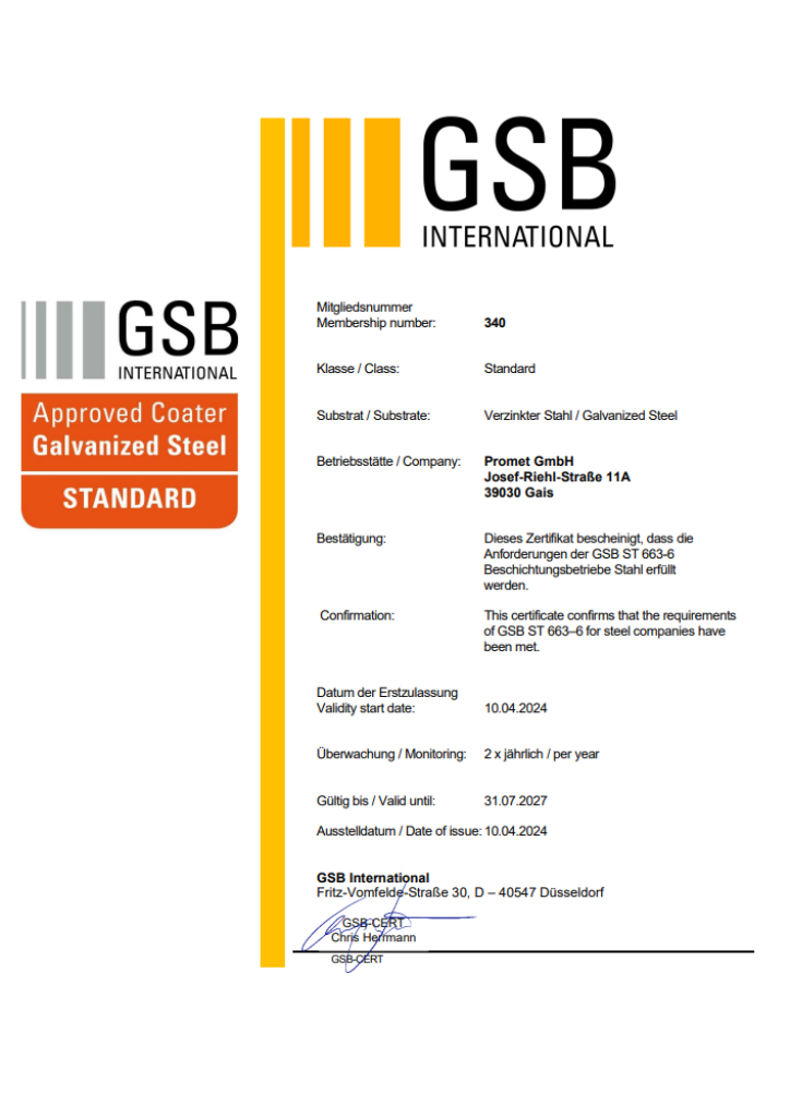 Pulverbeschichtung gemäß Anforderungen der GSB ST 663-6 mit einer Schichtdicke von mind. 80 Micron (500 h Salzsprühnebeltest lt. DIN 50021-SS oder ISO 9227 UV - Beständigkeit des Pulvers lt. Garantietabelle Qualicoat).